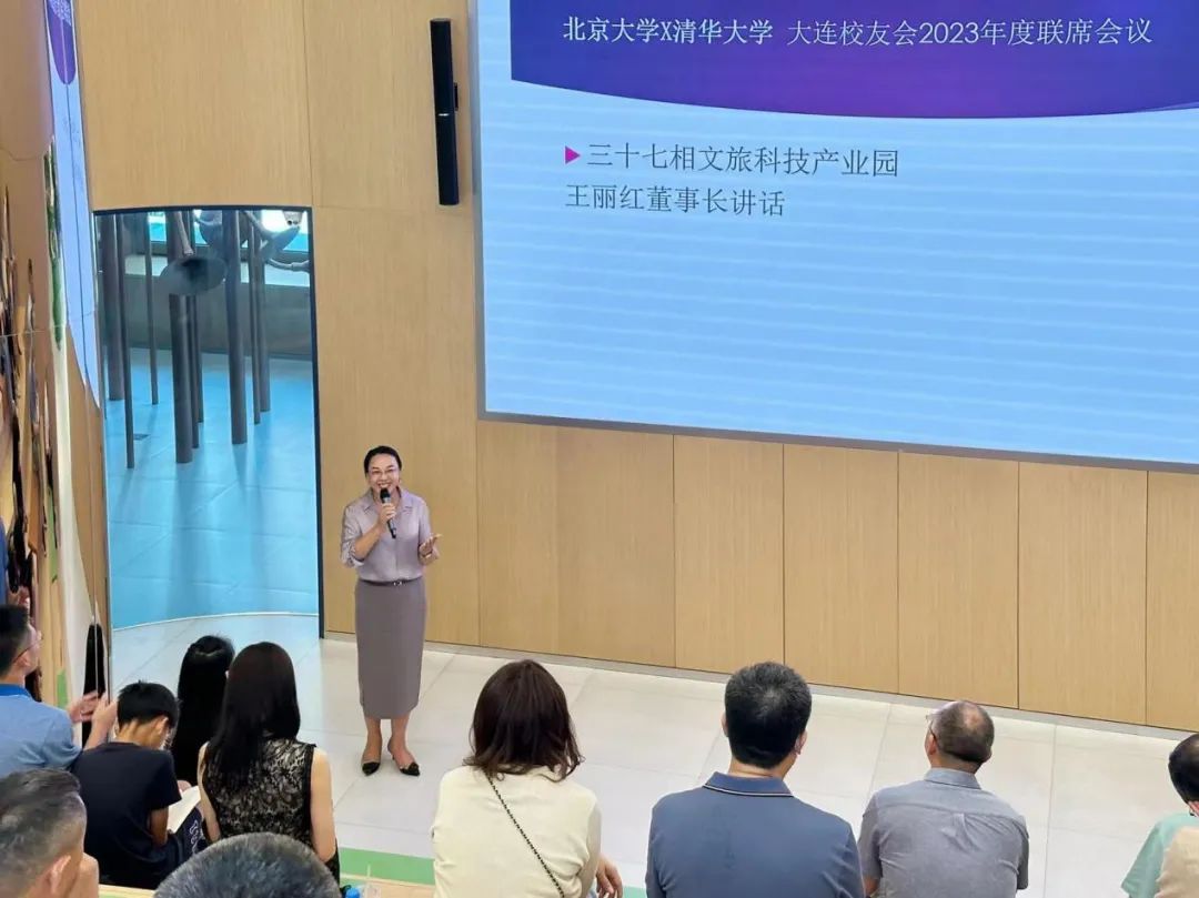 三十七相文旅科技产业园创始人、清华经管学院第35期总裁班的王丽红董事长致欢迎词。她说,非常荣幸2023年的北大、清华联席会议在三十七相举行。三十七相是清华校友设计并荣获多项国际金奖的城市更新项目,其前身是辽宁无线电二厂,历经两年的时间,清华校友将废弃的厂房焕发生机,打造成了一座向上、向善、向美的城市庭院。三十七相的设计是以大连的山海地域特征,海浪与风帆、丘陵与山峦波动起伏的特点为设计语言,以浪漫、简约为美学追求,塑造了“半山之间方寸海”的文旅生活空间。三十七相名字的由来是源于坐落在西岗区长红街的37号,“相”代表了相互信任、相互扶持、相互成全,也借此表达一种祝福,希望来到三十七相的每一位朋友都能感受到美好就在身边的身心享受。建设三十七相的初心是源于我对这座城市的热爱,是发自内心的一种回馈,我认为我今天的成就是这座城市给予的,当我有机会、有能力为这座城市和城市里的人们做一点事情的时候,我会特别珍惜这个机会,希望三十七相能给人们带来精神上的富足,满足人们对美好生活的向往,也希望三十七相能给各位带来美好的回忆!