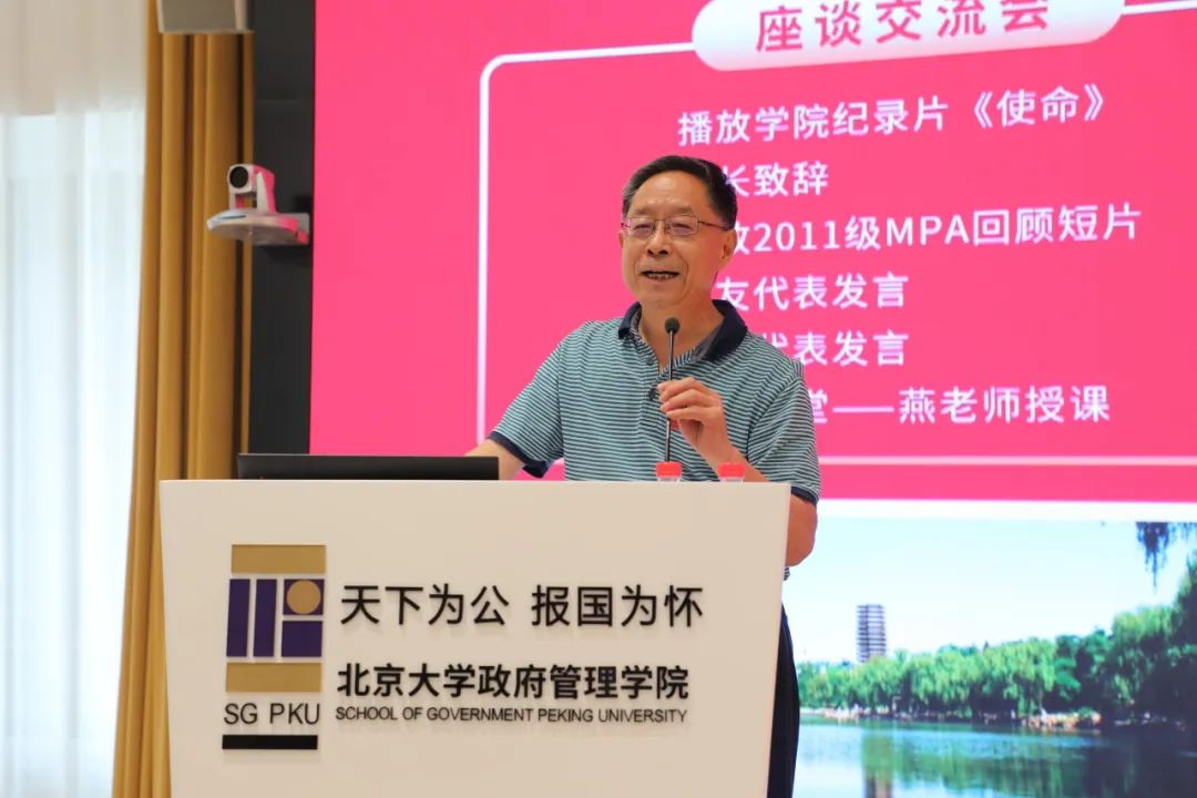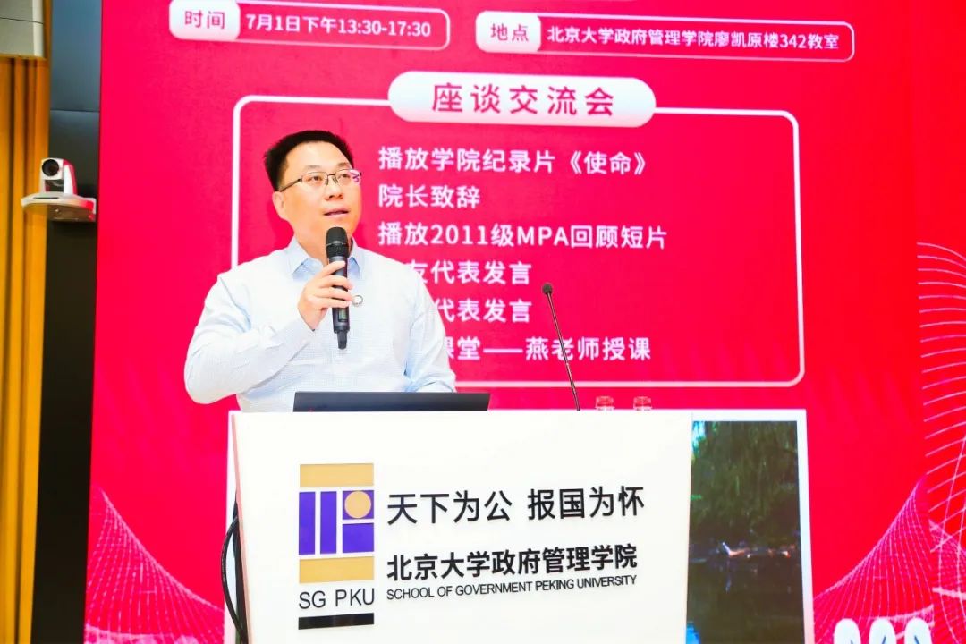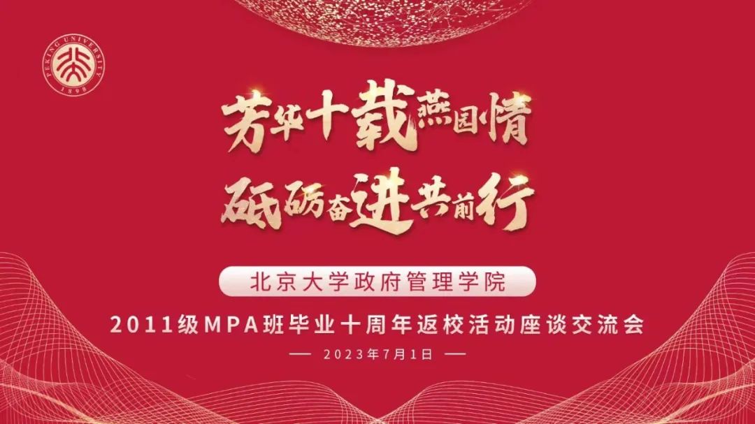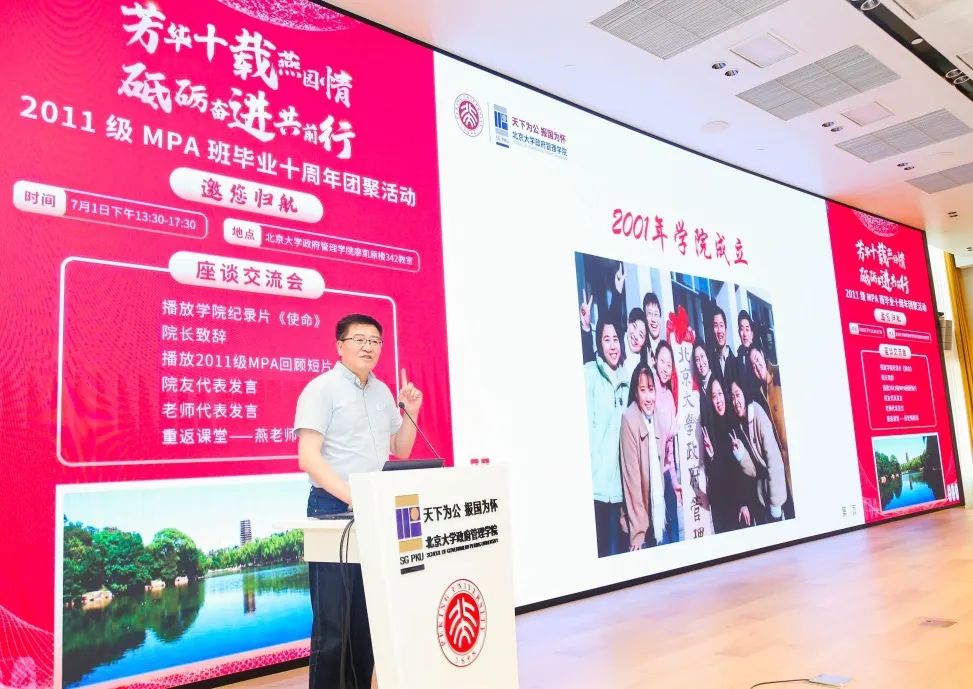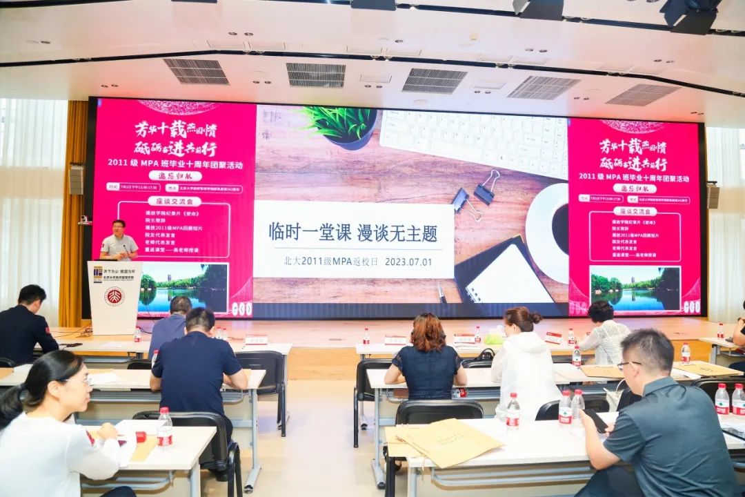 纵横四海,十年夏至。为纪念毕业10周年,2023年7月1日下午,政府管理学院2011级MPA班学员团聚燕园,重叙峥嵘岁月,共话前程万里。北京大学政府管理学院院长燕继荣、党委书记李海燕、副院长黄璜、党委副书记刘明乾、教师代表周志忍、金安平参加交流座谈会。座谈会于廖凯原楼342教室举行,由11级MPA班院友么宁主持。
