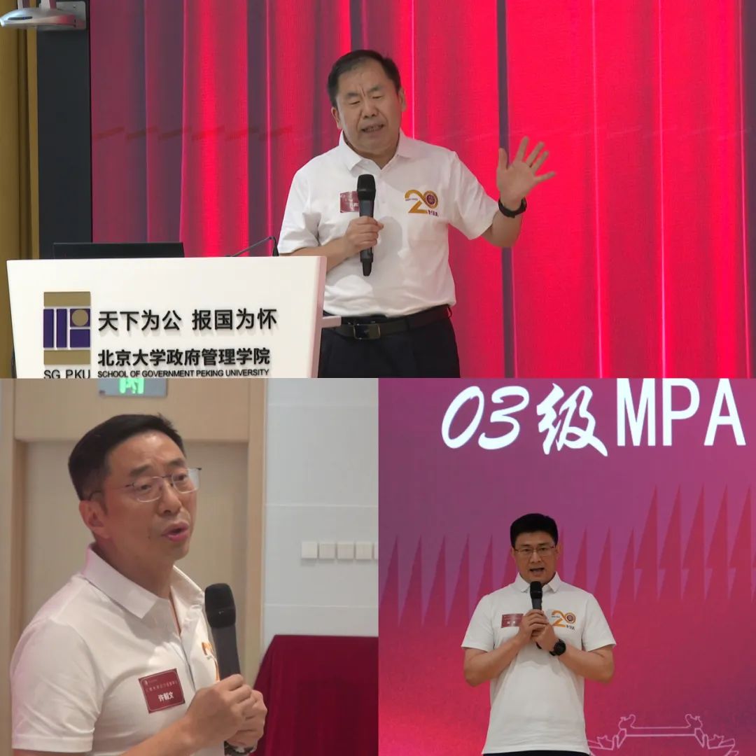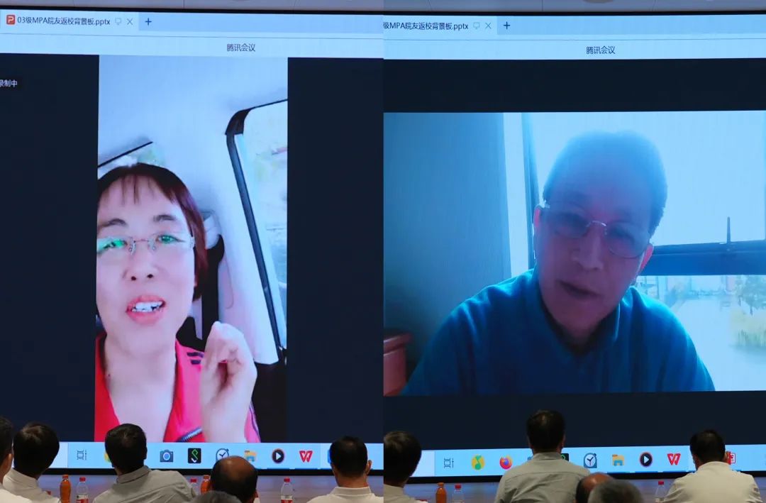 2004级MPA院友代表白凤祥以线上的方式参与座谈会,他对老师和同学们的发言感到心潮澎湃。他首先代表2004级MPA学弟妹们向2003级的学长姐们毕业20周年返校重聚表示祝贺,同时也对老师们的谆谆教诲表达了感谢。随后,他分享了这些年来自己在学习、工作和生活上的心得。最后,他表达了对老师和同学们的祝福,希望大家身体健康、工作顺利。随后,2003级在场院友代表也发表了感言。齐胜利深情表达了对学院老师辛勤培养教育的感激之情,这为院友们一生的成长进步奠定了坚实的基础。他希望大家不怕困难、不怕挫折,坚实走好人生的每一步,还对援藏期间全班同学为藏族困难学生捐资助学行动表达了真挚谢意。许毅文对在北大的经历表示感谢,他祝愿各位院友也能一切顺利。刘景感叹二十年时光转瞬即逝,虽然无法控制让年华不老去,却可以让才华越来越多。他鼓励大家要克服对未知和不确定性的恐惧,勇于改变。最后,他感谢母院的关注和班委、同学们为此次聚会的付出,祝愿大家的友谊能够天长地久。