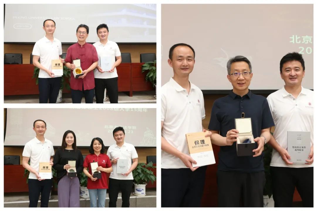 随后,筹备组代表2008级全体法律硕士校友向学院和老师们表达了最诚挚的思念与感谢,向老师们赠送本级校友天津高院李阿侠法官、北京三中院禹海波法官的两本专著作为纪念。筹备组简要汇报了全体校友在各行各业的总体情况,其中250多名校友目前分布在中央部委、地方政府、央企国企、公检法系统、律师、金融机构、投资机构、高校等,在各自行业领域积累了十余年跨越周期的观察和思考。而当下,时代变革愈加波澜壮阔,挑战与机遇的碰撞、冲击愈加激烈,希望所有人如郭雳院长所希望的努力习得面对周期的能力,如梁根林教授所嘱托的始终坚守法律人应有的法律思维、法律逻辑、法律信念,希望所有同学都能常回家看看,为学院发展积极贡献自己的力量。