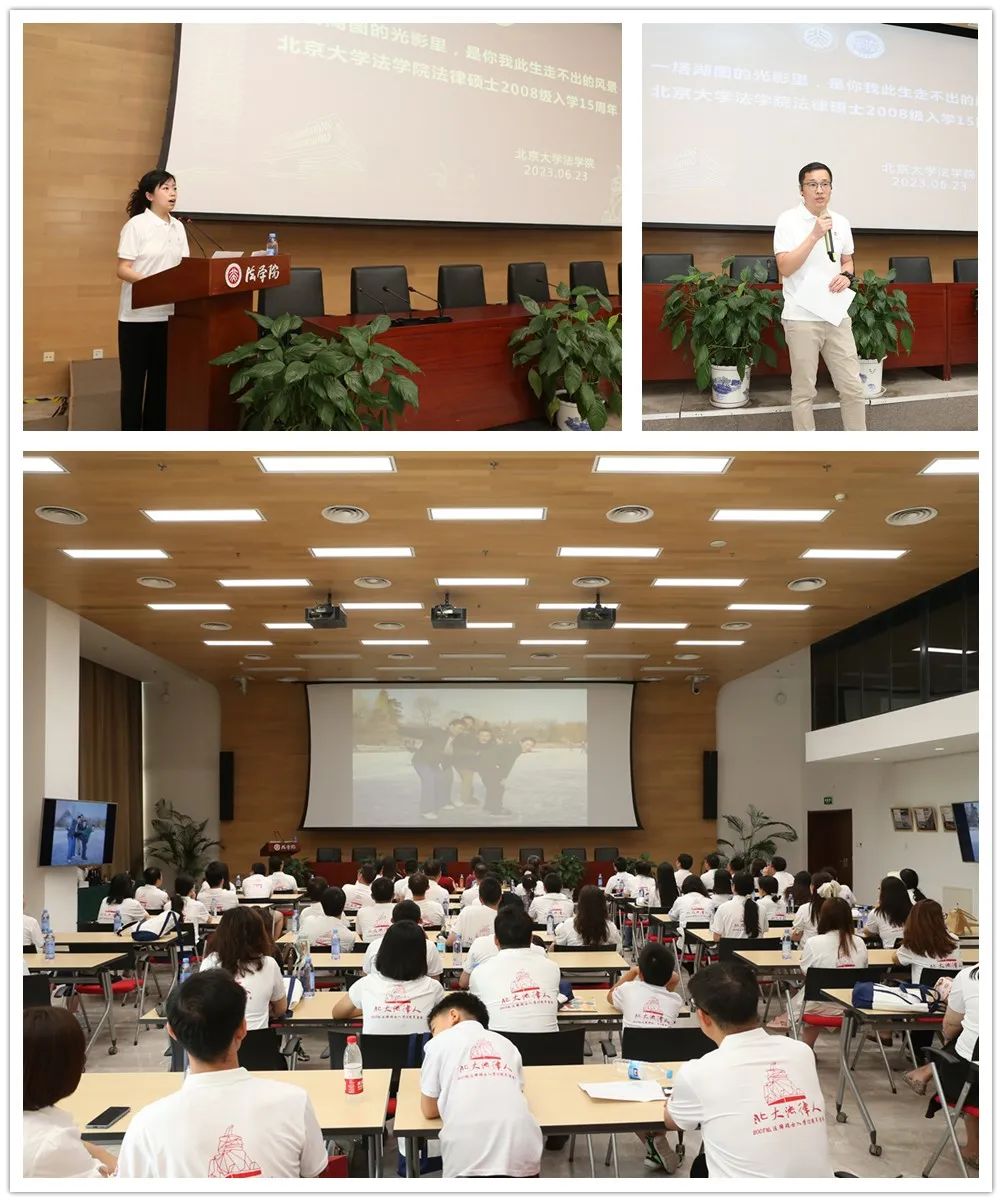 2023年6月23日下午,北京大学法学院2008级法律硕士校友入学15周年返校纪念活动在法学院凯原楼一层报告厅举行,现场欢声笑语、掌声不断。法学院院长、党委书记郭雳教授,梁根林教授,校友工作办公室主任党淑平、副主任鲁昕鑫应邀出席。2008级法律硕士校友从国外和全国各地返回校园,重新聆听老师教导,共同追忆求学时光。此次活动由校友郭文奇、张化全主持。