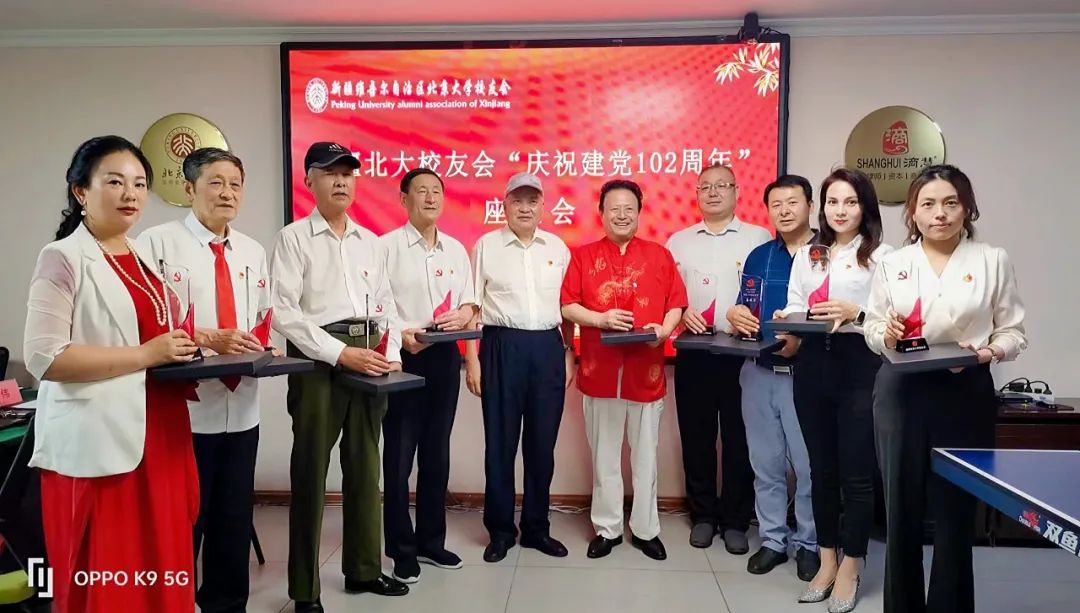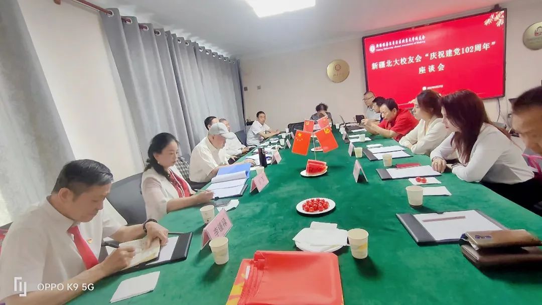 2023年6月27日下午,新疆维吾尔自治区北京大学校友会(以下简称:新疆校友会)在乌鲁木齐市沙依巴克区扬子江路街道天安名门召开新疆校友会“庆祝中国共产党成立102周年”座谈会,新疆北大校友会会长闫科培,常务副会长兼秘书长罗英,名誉会长张野,副会长赵伟,顾问李锺禄、李振法,办公室主任姜晓宏,宣传部部长阿依努尔·卡马,办公室副主任辛燕玲,党支部组织委员刘霞,校友李鹰出席会议,会议由罗英主持。