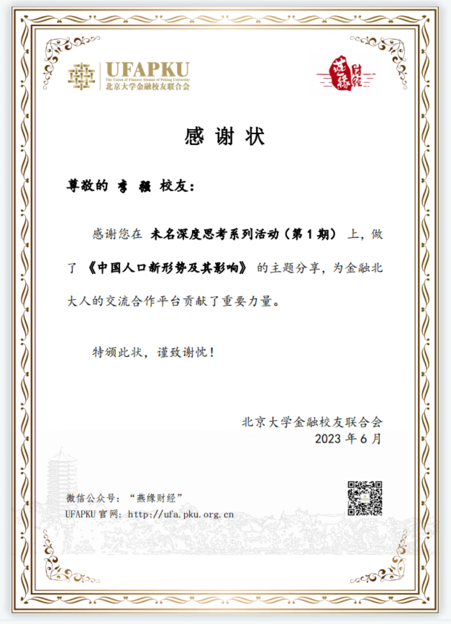 2023年6月10日下午,北京大学金融校友联合会举办“未名深度思考”首期活动,邀请复旦大学老龄研究院教授、北大2001级人口研究所博士校友李强,作“中国人口新形势及其影响”专题分享。本次活动通过线上形式(腾讯会议)举行,在“燕缘财经”视频号同步直播。