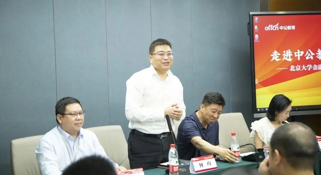 参访团与中公教育召开专题座谈会,中公教育集团副总裁何玓(北京大学政治学与行政管理系1995级本科校友)、中公教育集团副总裁张红军(北京大学政府管理学院政治学专业2012届博士校友)出席座谈。双方围绕职业教育行业动态、智慧数字教育应用、企业经营管理和金融服务实体企业等问题进行深度探讨,并就教育行业校企合作和相关建议等事宜进行了深入的交流。