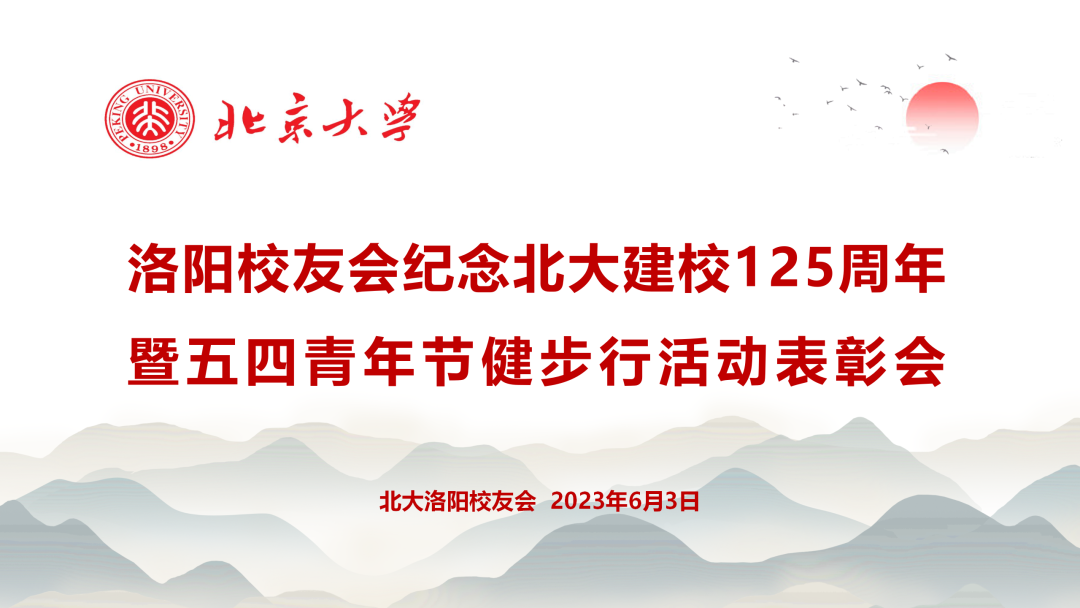 2023年6月3日,北京大学洛阳校友会(以下简称“洛阳校友会”)召开纪念北京大学建校125周年暨五四青年节健步行活动表彰会,健步走活动于5月4日至5月15日通过微信公益“一起走”举行。