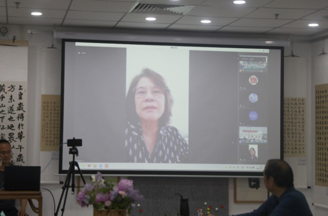 北京大学原常务副校长柯杨,也是理事会新任副会长,通过线上参加本次理事会。柯杨表示,作为北京大学校友书画协会2017级书法公益班的一名学员,她不仅见证了协会的蓬勃发展,更是在各方面受益良多。在发言中,柯杨充分肯定了协会七年来的工作成就,并代表周其凤、吴志攀感谢郭俊杰会长、方建勋老师教学团队和广大学员志愿者们的无私奉献。