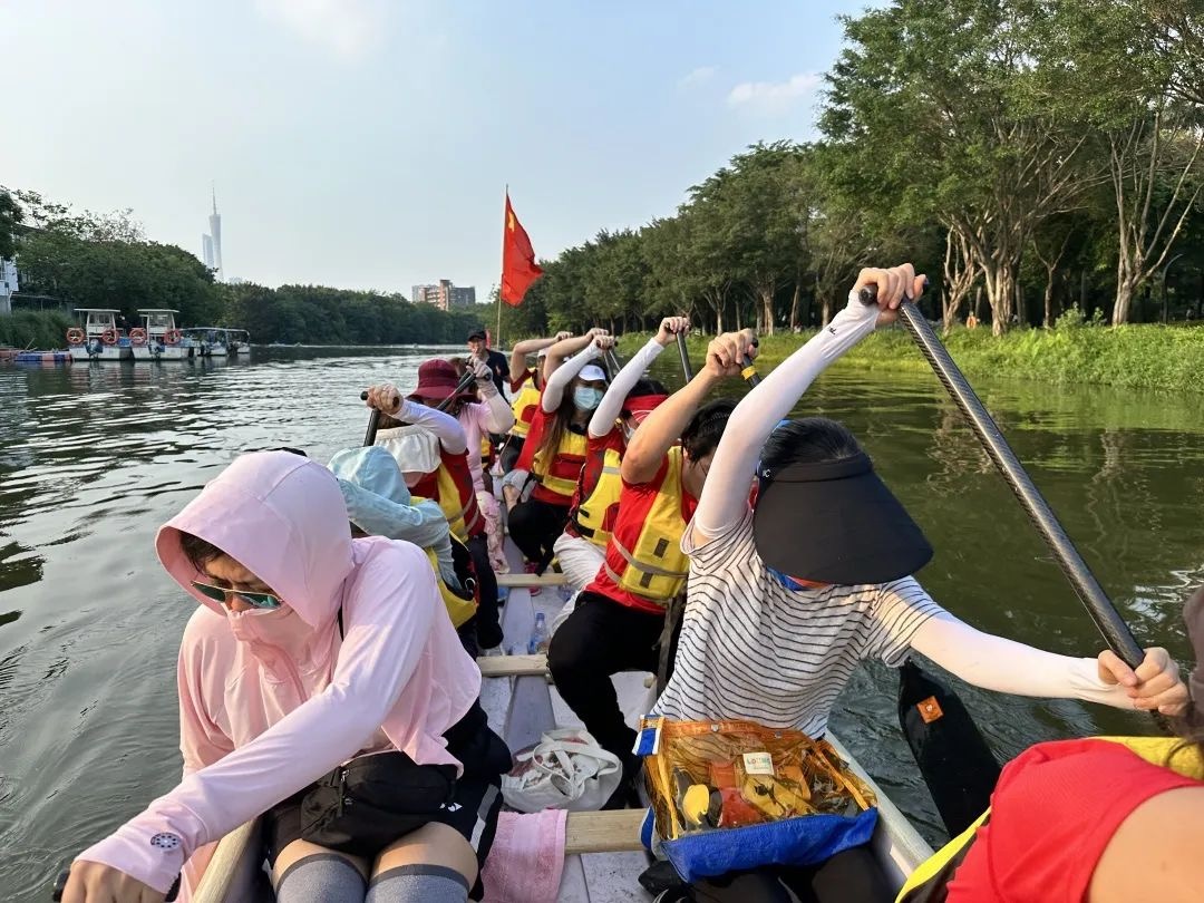 一路上,大家欢歌笑语,边学习划龙舟要点知识,边欣赏沿途各色美景。“舟行碧波上,人在画中游”的诗句描绘的就是此刻的可爱校友们。虽然是第一次划龙舟,但校友们都很勇敢,虚心好学。在教练手把手的指导下,很快调整姿势,喊着统一的口号往前划,龙舟快速往前移动着。最后,经过反复练习和不懈努力,大家顺利完成了海珠湖环湖一圈,为本次划龙舟活动画上了圆满的句号。