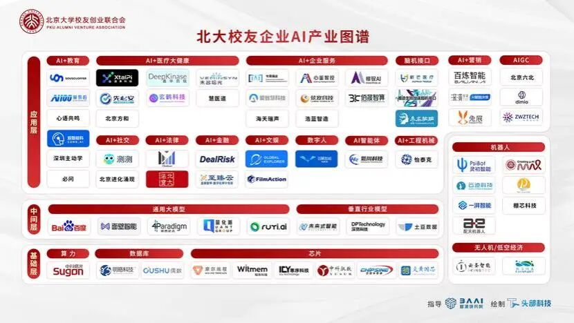 北大校友创业联合会秘书长朱宸佑发布了“北大校友企业AI产业图谱”,该图谱收集整理了近70个校友企业AI项目,涵盖基础层、中间层到应用层的全产业链生态,直观呈现了北大校友在人工智能领域的创新活力与产业影响力。