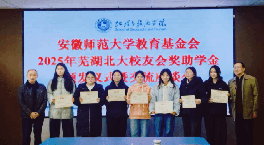 3月20日,2025年度芜湖市北京大学校友会奖助学金颁发仪式在安徽师范大学地理与旅游学院三楼会议室举行。芜湖市北京大学校友会常务副会长童劭琼、副会长周玉森等出席仪式。仪式由地理与旅游学院党委副书记钱程主持。