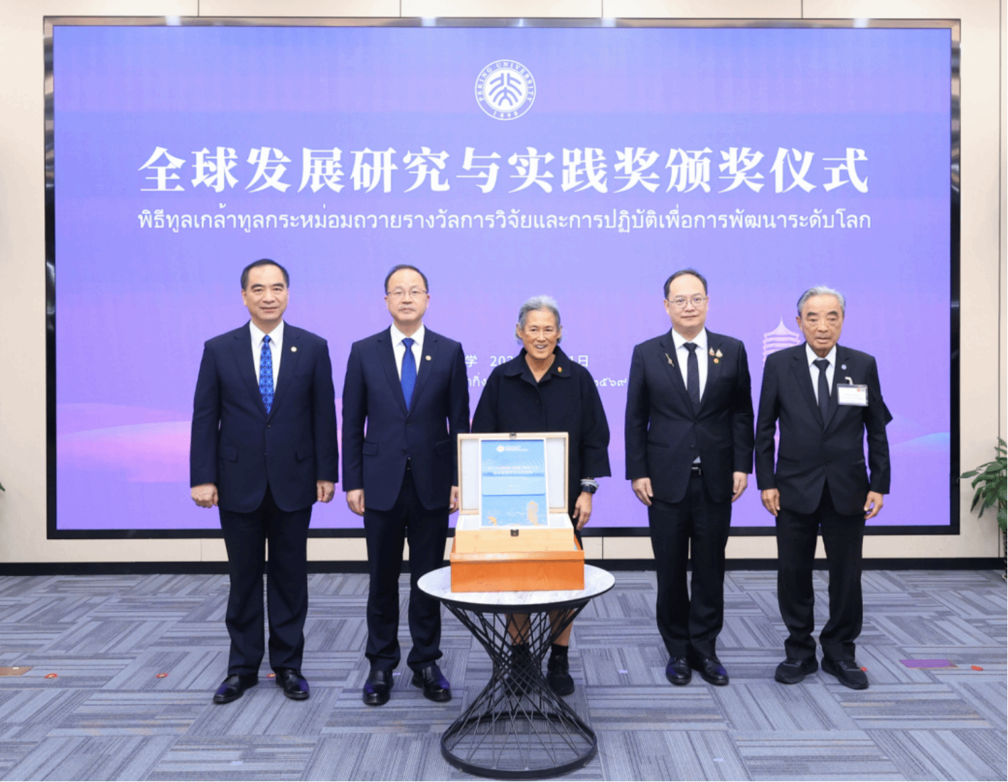 随后,“全球发展研究与实践奖”颁奖仪式在学术交流中心第二会议室举行。该奖项旨在表彰为全球南方发展作出卓越贡献的杰出人士。姜国华主持仪式,龚旗煌致辞并宣读授奖决定。何光彩与龚旗煌共同为诗琳通公主颁奖,中共中央宣传部理论局负责同志参加活动。
