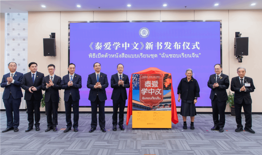 颁奖仪式后,《泰爱学中文》新书发布仪式举行。方方主持并介绍,该教材由诗琳通公主殿下担任编委会荣誉主任,北京大学与朱拉隆功大学的专家学者联合编写,北京大学出版社出版。中泰双方嘉宾共同为新书揭幕。