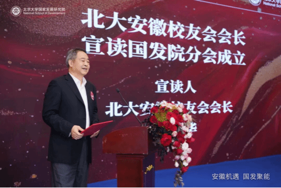 安徽北大校友会会长赵国华宣读安徽北京大学校友会国发院分会成立批复文件,宣布安徽北京大学校友会国发院分会正式成立。