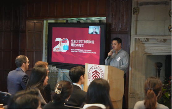 庆典仪式在14:00正式开始,由英国校区主任助理韩冰主持。校友和嘉宾一同观看了北大汇丰商学院20周年庆典的精华视频,介绍了汇丰商学院二十年发展的壮阔历程。北大汇丰副院长Young Joon Park在深圳校区通过视频连线发表了致辞。