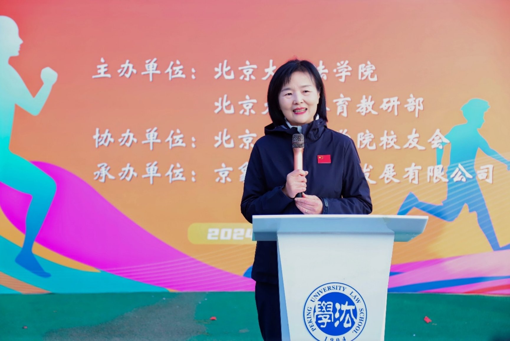 郭雳在致辞中向远道而来的各位校友表示热烈欢迎,对筹备本次活动的组织团队表示感谢。他表示,在北大法学院走过百廿征程这一历史节点,北大法马12小时健康跑不仅是一场体育竞技活动,更是一次精神的洗礼与升华。他强调,作为北大法律人,更要积极践行重视体育、追求健康的生活方式,弘扬北大精神,以强健体魄书写北大法律人的崭新篇章。