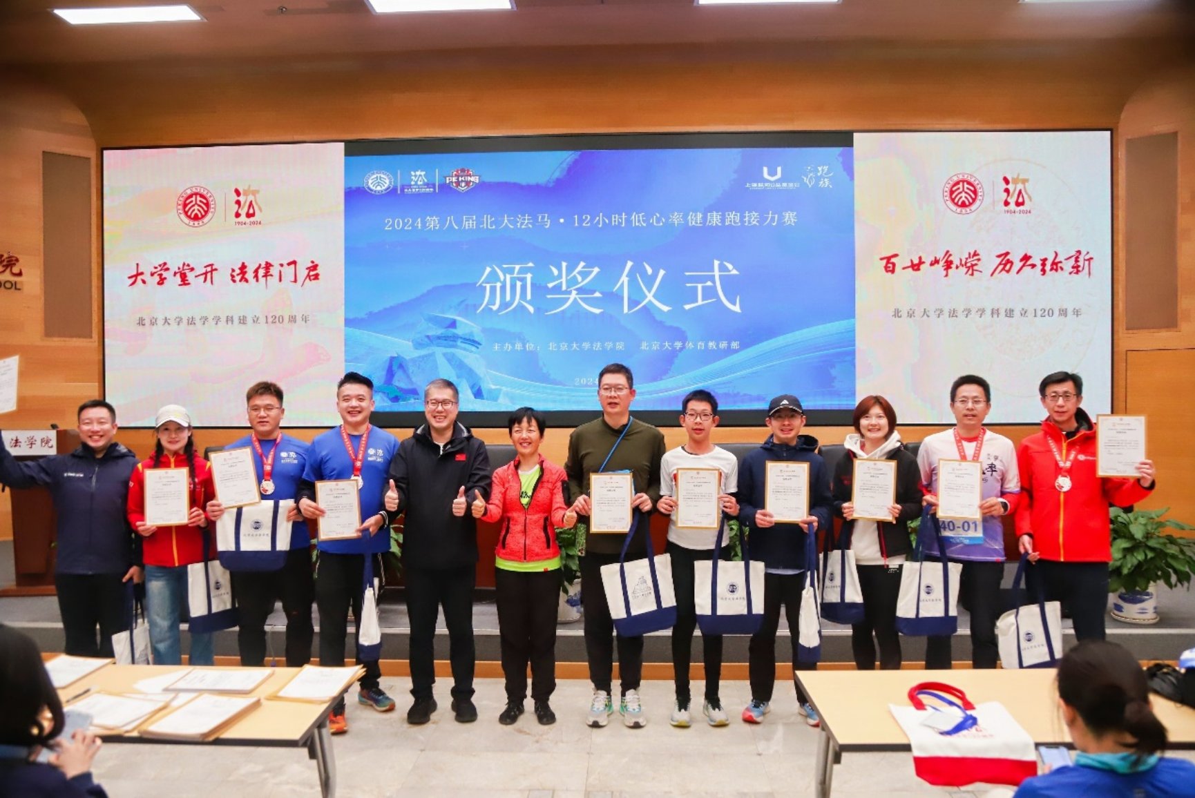 经过12个小时的比赛,共有56支队伍顺利完赛。低心率超级马拉松跑者于淼以总成绩258圈、总平均心率113次/分夺得赛事冠军。晚上9时,颁奖仪式在北京大学法学院凯原楼报告厅举行,北京大学法学院党委副书记路姜男,北京大学法学院杰出校友代表、“百城百马”奖学金发起人孙嘉鸿为获奖队伍颁发完赛证书及奖品。