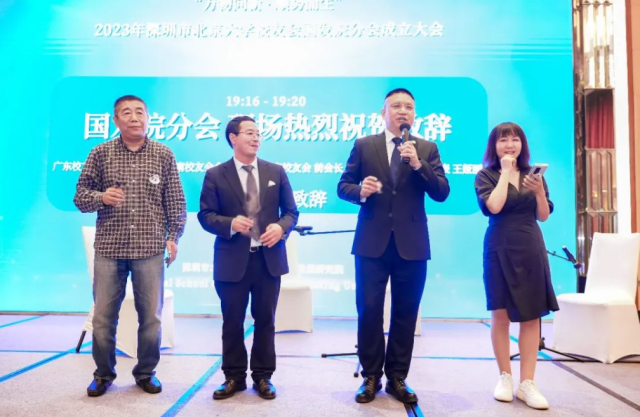 广东校友会会长郭旭光、海南校友会会长杜龙、重庆校友会副会长王道鸿、东北校友会代表王娅丽、湖南校友会代表李伟灏分别上台致辞,并向深圳校友会国发院分会的成立表示祝贺。后续播放了来自香港、山东、江苏、上海、四川等地校友会的视频祝福以及贺信。深圳市北大校友会国发院分会成立大会在一片其乐融融的气氛中圆满结束。