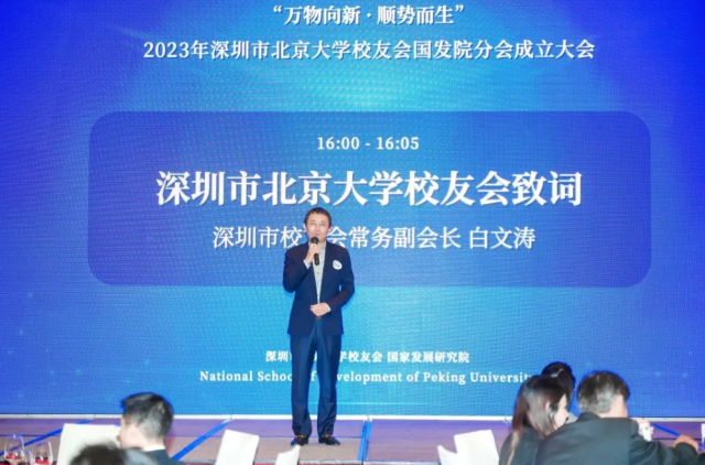 大会上,深圳市北大校友会常务副会长白文涛首先致辞。他向深圳校友会国发院分会的成立表示热烈祝贺,并送上美好的祝愿。