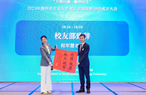 最后,姚洋院长宣读了深圳校友会国发院分会架构及理事会成员名单,并现场向国发院分会授牌。周延总会长亲自将国发院分会的旗帜交到了陈义枫会长手中。学院老师向全体理事会成员颁发聘书。