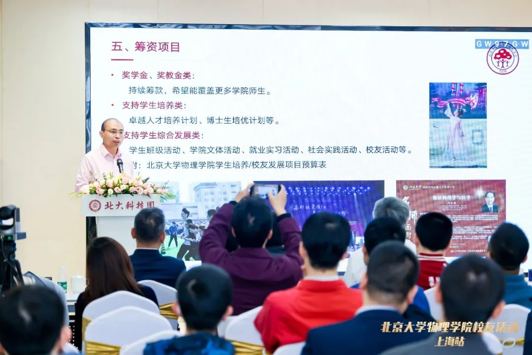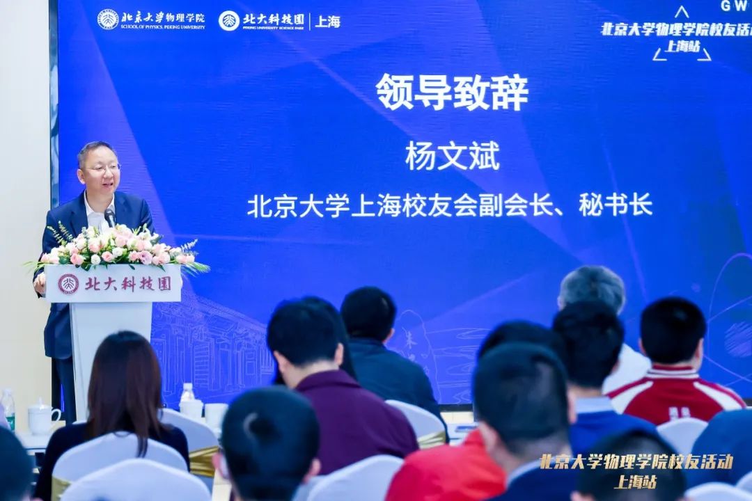 北京大学上海校友会副会长、秘书长杨文斌在致辞中表示,一方面,在上海的北大校友人数多、分布广,应该借此次活动契机把上海的物院校友凝聚起来,并与上海校友会加强交流合作,促进资源共享。另一方面,杨文斌学长表示,他作为北大地球物理系1988级校友,深刻感受到物理学所训练的思维对于未来任何工作都大有裨益。杨文斌学长号召广大物理人团结起来,一起回馈母校,并祝愿北大物院的明天越来越好。