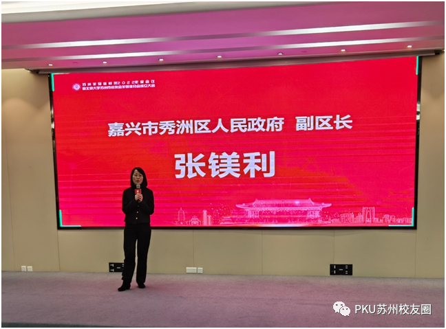 浙江省嘉兴市秀洲区人民政府副区长张镁利受秀洲区区长、北京大学社会学系1994级校友刘德威的委托,为苏州半导体协会的成立送来诚挚的祝贺,同时表示热烈欢迎北大从事半导体产业的企业家校友能够走进嘉兴秀洲看一看,落地秀洲,共同为中国半导体事业的发展贡献力量。