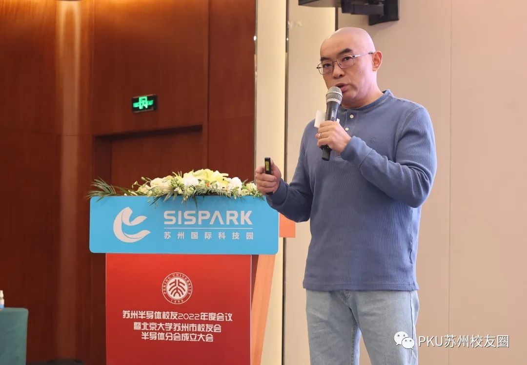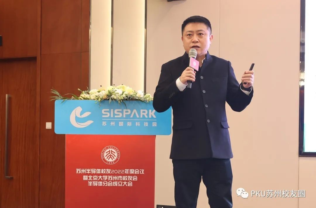 中国半导体协会副秘书长刘源超致辞。他认为这是一个令人激动的时刻,北大人能够在苏州号召半导体行业校友企业家成立分会是一件美好的事情,必将对中国半导体事业发展具有推动意义,在目前形势下北大人更需要团结努力,为国家的半导体科技自主自强做出应有的贡献。