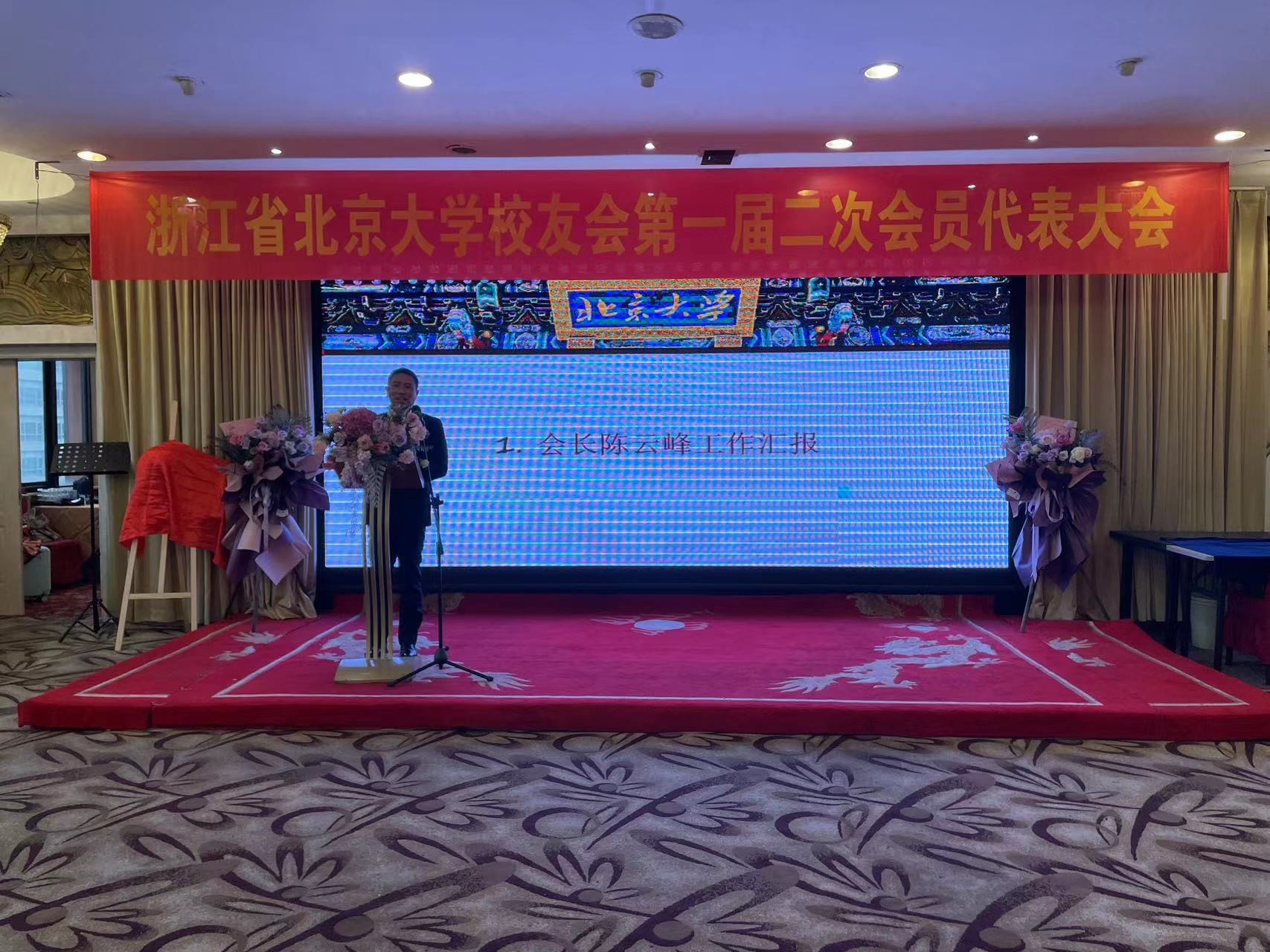 首先,浙江省北京大学校友会会长陈云峰作浙江省北京大学校友会年度工作报告。陈云峰在报告中回顾浙江省北京大学校友会自2021年12月26日成立以来所做的工作,重点总结申请社会团体法人登记证书相关工作;并表彰为校友会登记注册而无偿捐赠资金的校友会发起人、部分热心校友,以及付出辛勤努力的校友。陈云峰还就下一年工作重点进行介绍。