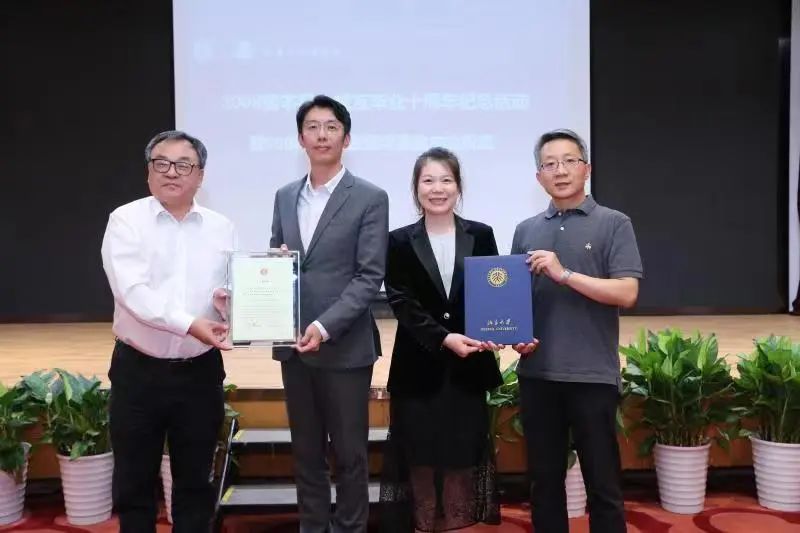 在奖学金成立仪式上,潘剑锋、郭雳为2008级全体本科校友颁发捐赠证书,徐昆、赵倩作代表08级本科全体校友领取证书。