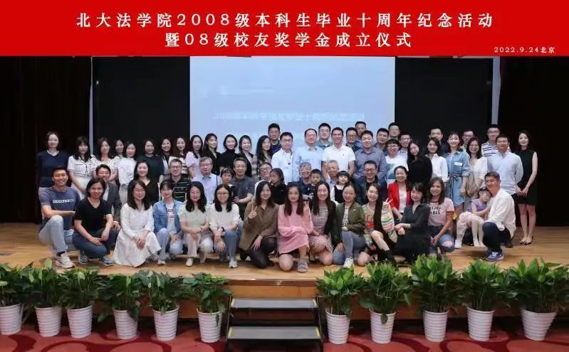 2022年9月24日,北京大学法学院2008级本科校友毕业十周年纪念活动暨08级本科校友奖学基金成立仪式成功举办。在严格遵守防疫要求的前提下,2008级部分校友及家属汇聚一堂,在母校附近的会议厅共同举办了此次纪念活动。身在深圳无法到场的校友们特别设置了分会场,与北京主会场进行视频连线,共话情谊。