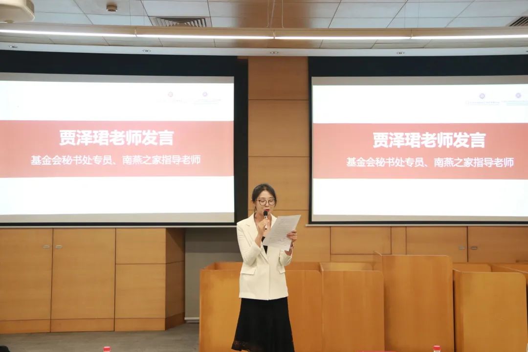 贾泽珺作为指导老师分享了自己从事教育慈善事业的初衷,她表示,南燕之家成员在助力基金会发展的过程中,可以收获人道主义情怀,了解象牙塔外社会真实的苦难,更加珍惜在学校专心学习的时光。最后,她送给同学们两句诗,“临水种花知有意,一枝化作两枝看”,希望大家珍爱自己的灵魂,健康成长,快乐生活。