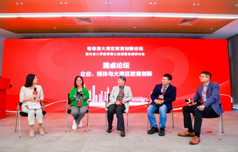 “企业、媒体与大湾区教育创新”圆桌论坛,由新华社广东分社对外报道中心副主任白瑜主持,深圳市北京大学校友会副会长、秘书长王芳,深圳市华大教育中心副院长杨东声,科大讯飞高校智慧教育研究院院长李礼,腾讯集团金融消费者权益保护部助理总经理金志华4位嘉宾围绕“企业需要怎样的创新型人才”展开讨论。