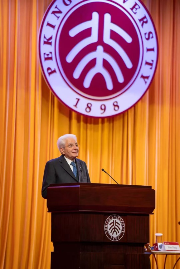 11月9日下午,在华访问的意大利总统塞尔焦·马塔雷拉(Sergio Mattarella)率代表团访问北京大学,并在北京大学办公楼礼堂发表主题演讲