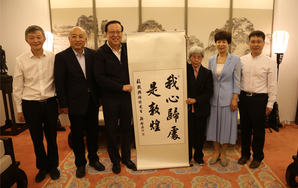 樊锦诗生日当天,郝平一行专程前往敦煌研究院看望樊锦诗,向她表示慰问与祝贺,并介绍了北京大学历史学、考古学学科的发展现状和樊锦诗教育基金使用情况。北京大学艺术学院教授顾春芳从樊锦诗自传《我心归处是敦煌》出发,讲述了社会各界对樊锦诗精神的钦佩与共鸣,以及由樊锦诗事迹带动的公众对莫高窟、对考古的关注与热爱,并赠送了本人创作和题写的诗卷。樊锦诗感谢郝平一行的来访,并表示,北京大学是她敦煌学研究的起点,学校为中国文物保护和研究作出了重要贡献。她希望北京大学继续加强与敦煌研究院的合作,互相交流、取长补短,共同培养更多优秀人才,为敦煌学研究持续提供智力和人才支持。