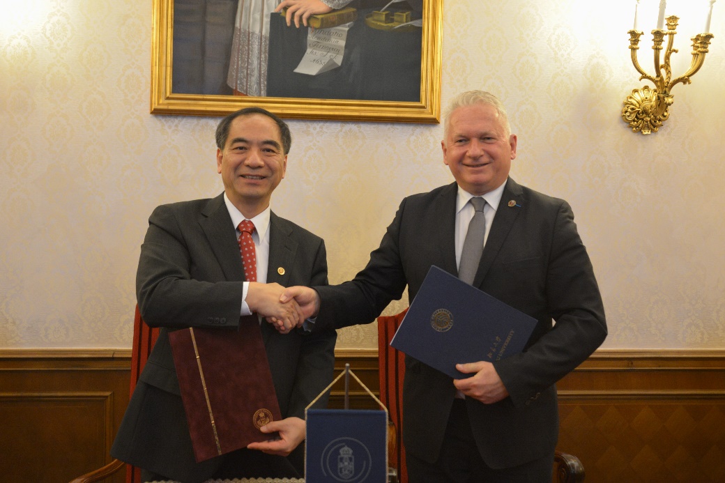 3月30日,龚旗煌一行拜会了罗兰大学校长薄慕往(László BORHY),并签署学生交换协议,两校将全面开展学生互派工作。龚旗煌表示,北京大学长期重视与匈牙利大学合作,希望通过开展学生交流等形式,推动两国青年人文交流,增进文化认同和理解。薄慕往表示,与中国的教育合作对罗兰大学具有重要意义,未来可在汉语教学、历史、数智教育方面加深合作。