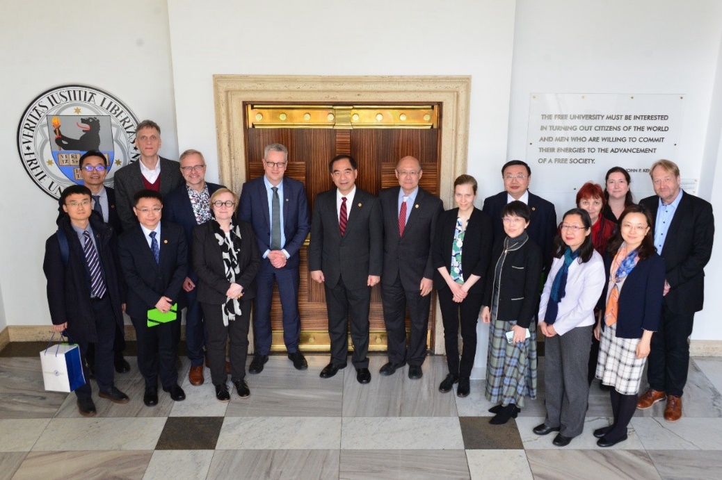 访问柏林自由大学期间,龚旗煌一行拜会校长齐格勒(Günter M. Ziegler)。长期以来,北京大学与柏林自由大学是互相信任的战略合作伙伴。龚旗煌表示,两校有学生交换、伊拉斯谟项目、联合博士后培养等广泛的人员交流形式,在区域国别、可持续发展校园等领域有深入的合作。齐格勒介绍了柏林自由大学的发展情况,并表示希望在人工智能、数学、神经科学、环境领域加强与北大合作。其间,北大代表团顺访了柏林自由大学孔子学院,并听取了工作情况汇报。