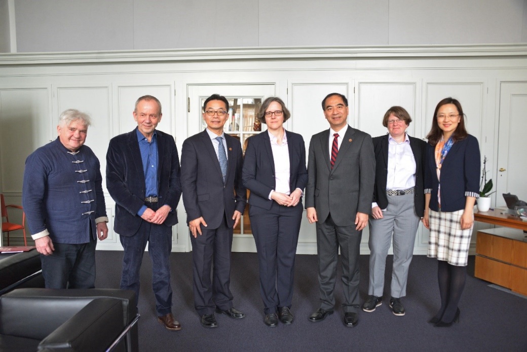 在访问慕尼黑大学期间,龚旗煌一行拜会了校长贝恩德·胡贝尔(Bernd Huber)及相关学者。双方回顾了两校的合作,贝恩德·胡贝尔对慕尼黑大学-中国学术网络情况、中国留学基金委(CSC)资助下的两校合作新突破等具有特色和示范性的交流合作进行了介绍。龚旗煌表示,今年是北京大学的“国际战略年”,北京大学希望与慕尼黑大学在既往坚实合作成果基础上,进一步拓展合作领域,推动在人工智能、公共卫生、环境等方面的联合研究。