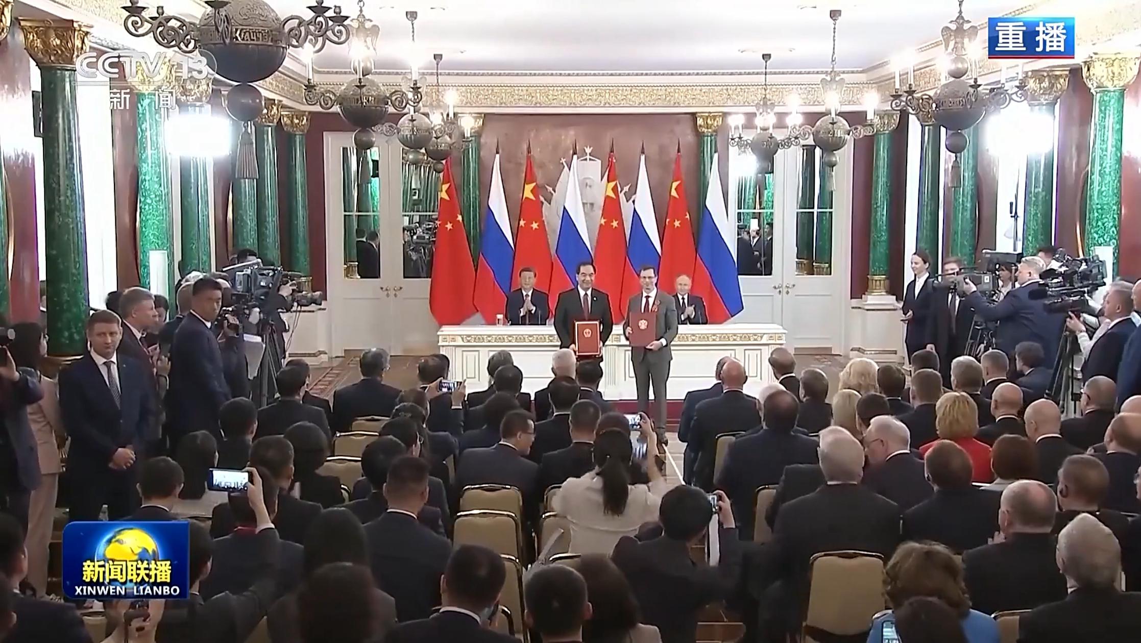 会谈后,两国元首共同签署《中华人民共和国和俄罗斯联邦在纪念中国人民抗日战争、苏联伟大卫国战争胜利和联合国成立80周年之际关于进一步深化中俄新时代全面战略协作伙伴关系的联合声明》,共同见证中俄双方交换20多份双边合作文本,涵盖全球战略稳定、维护国际法权威、生物安全、投资保护、数字经济、检疫、电影合作等领域。