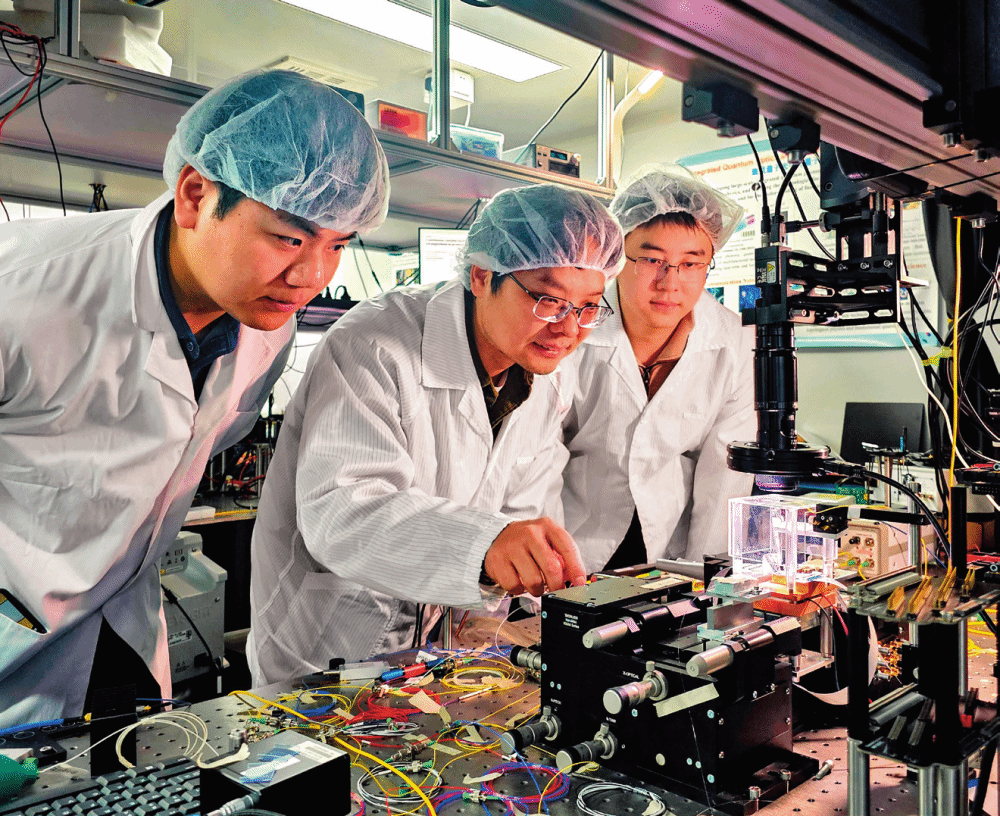 北京大学王剑威教授(中)与博士生贾新宇(左)和翟翀昊(右)在北大实验室测试集成光量子芯片