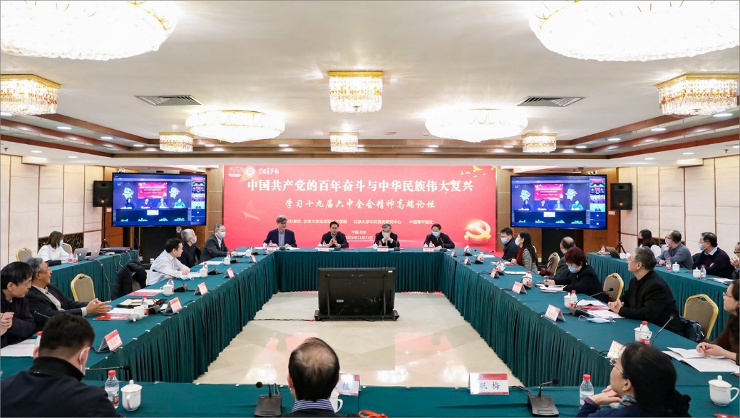11月21日,“中国共产党百年奋斗与中华民族伟大复兴——学习十九届六中全会精神高端论坛”在北大英杰交流中心以线上线下结合的方式举行。曹倩倩 摄