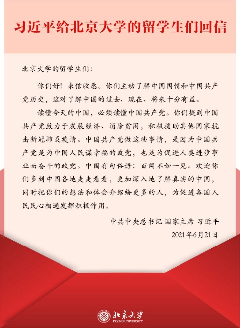 6月21日,中共中央总书记、国家主席习近平给北京大学的留学生们回信,鼓励他们更加深入地了解真实的中国,把想法和体会介绍给更多的人,为促进各国人民民心相通发挥积极作用。7月8日,国家主席习近平向南南合作援助基金和南南合作与发展学院成立5周年致贺信,希望南南合作援助基金继续帮助发展中国家实现可持续发展,南南合作与发展学院继续建好发展中国家高端人才培养基地和研究交流平台,为推动构建人类命运共同体作出更大贡献。回信和贺信在北大师生中引发热烈反响。北大师生认真学习贯彻落实好回信、贺信精神,并把回信、贺信精神切实转化为推动学校改革发展和进一步凝聚广大师生精气神的强大动力。