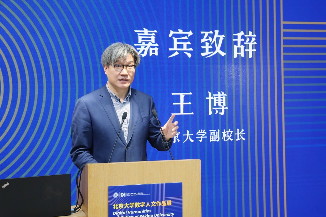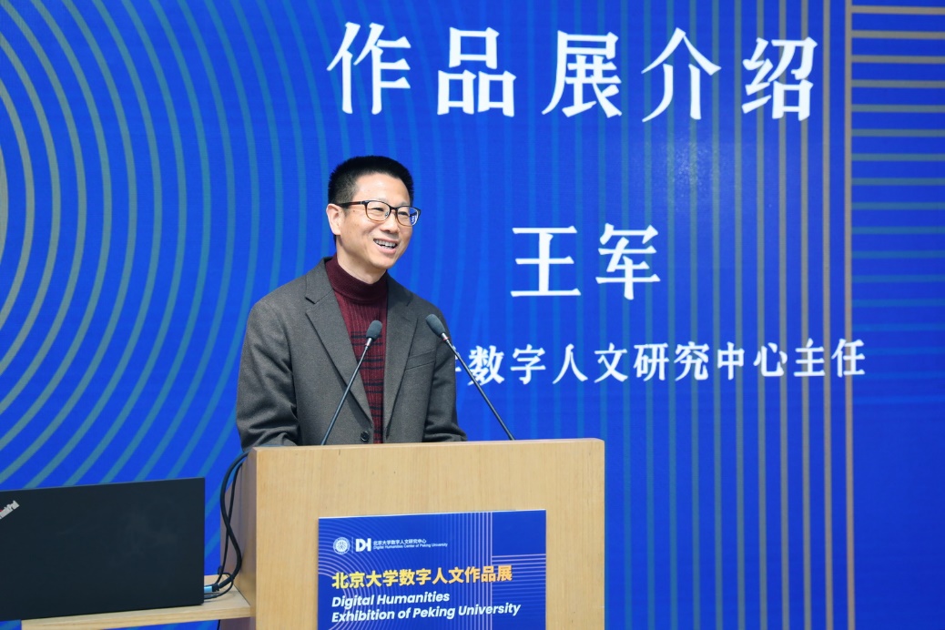 北大数字人文研究中心主任、信息管理系教授王军对本届数字人文作品展进行了介绍,并感谢学校领导、各院系师生的支持。