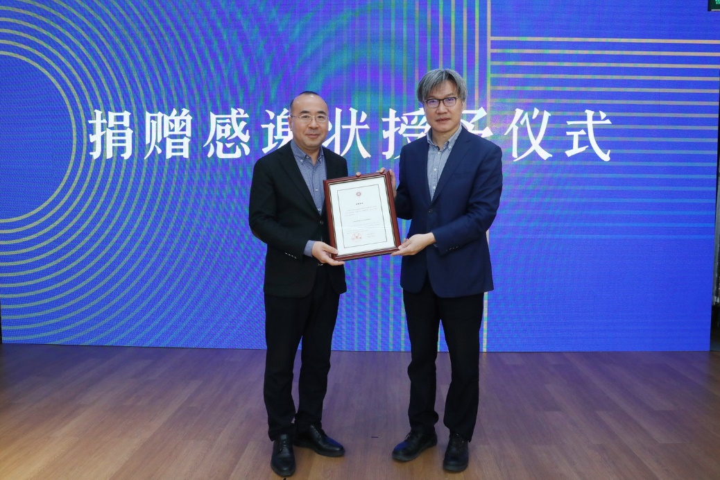 王博代表学校向李涛授予捐赠感谢状,感谢北京字节跳动对北京大学数字人文领域发展的支持。