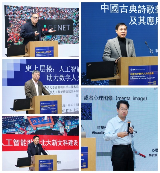 开幕仪式后,数字人文研讨会举行,由北大社会科学部副部长、艺术学院教授向勇主持。北大视觉与图像研究中心主任、历史学系教授朱青生,清华大学人工智能研究院常务副院长、计算机科学与技术系教授孙茂松,北大智能学院院长朱松纯,中国语言文学系主任杜晓勤,智能学院教授袁晓如,以及王军分别以“北京大学汉画研究所的计算艺术史探索”“更上层楼:人工智能助力数字人文”“人工智能助力北大新文科建设”“中国古典诗歌声律分析系统及其应用举隅”“数字人文中的可视化”“作为信息基础设施的数字人文”为题发表了主旨演讲。