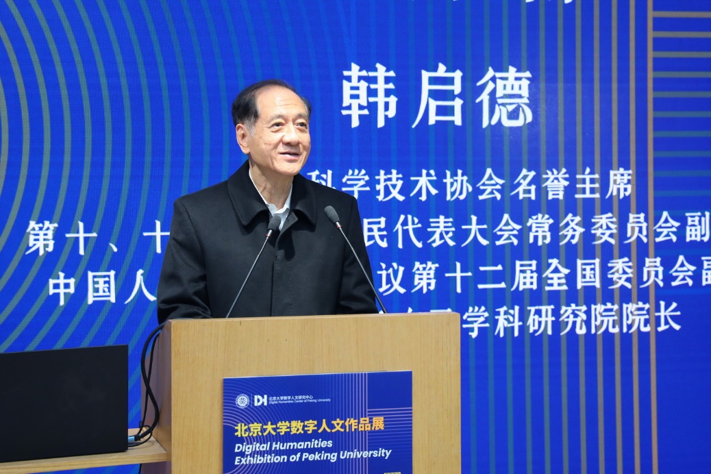 韩启德在致辞中表示,本次展览的各类作品异彩纷呈,展览涉及的主题很全面,内容专业性强,彰显了北大数字人文的实力和发展的决心。这次展出的数字人文作品来自校内20多个单位,包括文科、社科、理科、工科等,主题涉及古典文献、课程创新、历史地理、社科计算等领域,展示出北大在学科交叉和原始创新方面的巨大潜力和蓬勃动力。数字人文必将成为人文学科新的增长点,人文学科不仅是应用数字技术,反过来也会对数字技术、信息技术等产生重大的影响。他希望北大师生再接再厉,不断攀登学术研究的高峰,走在国际学术研究的最前沿,创作出更好、更美、更新的好作品。