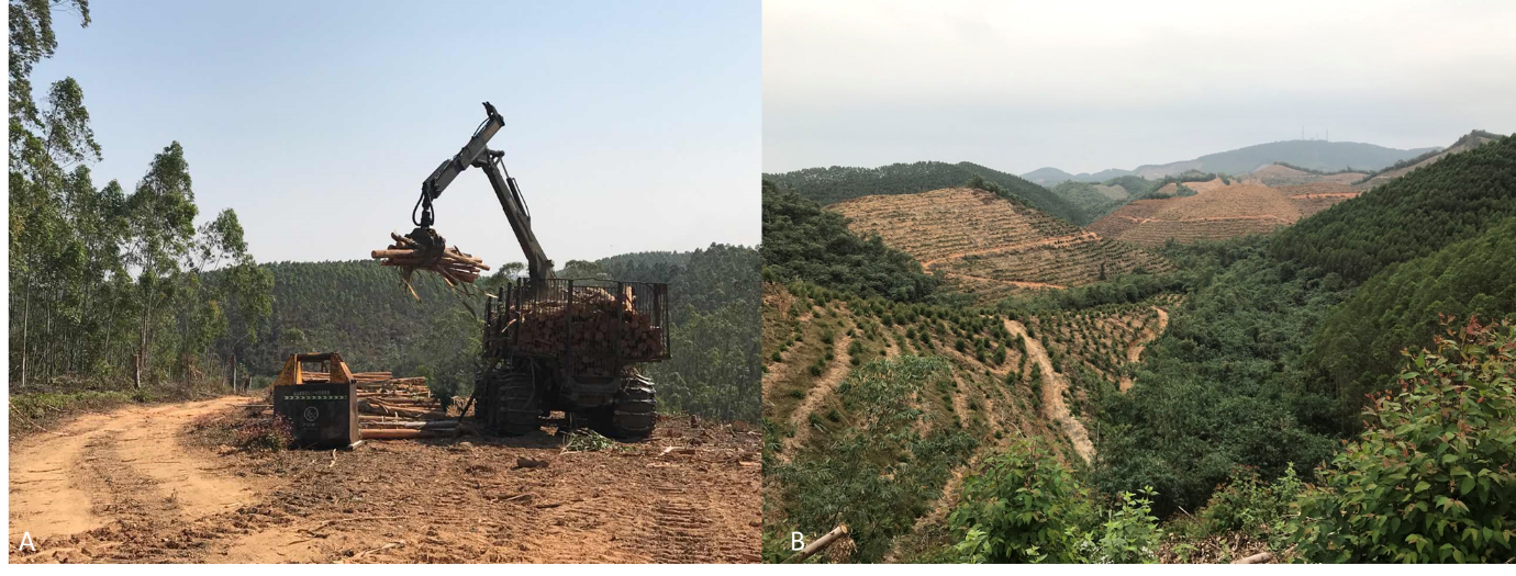用于木材生产的人工林:A-广西省合浦县的速生丰产桉树人工林;B-广西省高峰林场主要用于木材生产,但也保留有天然林的森林景观(图片来源:华方圆)