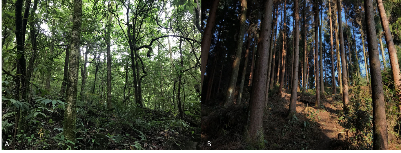 天然林与人工林景观:A-四川省大相岭省级自然保护区中的天然林;B-四川省洪雅县境内的柳杉人工林(图片来源:华方圆)