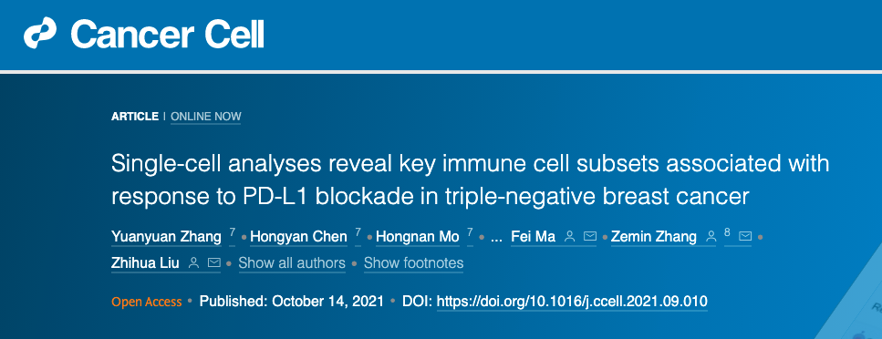 2021年10月14日,北京大学生物医学前沿创新中心(BIOPIC)、生命科学学院,北京未来基因诊断高精尖创新中心(ICG)张泽民课题组联合中国医学科学院肿瘤医院刘芝华课题组、马飞和徐兵河课题组,在国际期刊Cancer Cell上以Article形式在线发表了题为“Single-cell analyses reveal key immune cell subsets associated with response to PD-L1 blockade in triple negative breast cancer”的研究论文。