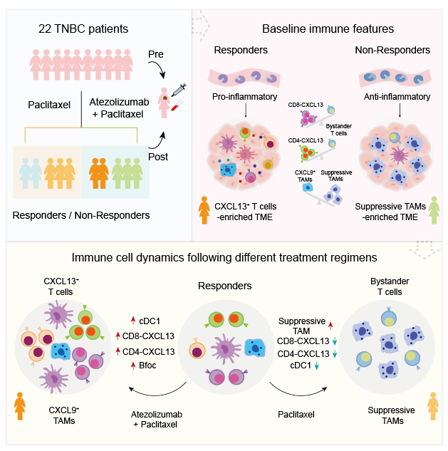 乳腺癌位于女性恶性肿瘤之首,其中三阴性乳腺癌(Triple-Negative Breast Cancer, TNBC)是复发率和死亡率最高的乳腺癌亚型。TNBC对激素疗法和靶向疗法均无效,目前以传统化疗为主要治疗手段,但效果不甚理想。尽管癌症免疫治疗已进入快速发展时期,TNBC的免疫治疗却举步维艰: 虽然早期IMpassion 130临床试验表明,anti-PD-L1抗体阿替利珠单抗(Atezolizumab)联合白蛋白结合型紫杉醇(Nab-paclitaxel)能够显著降低PD-L1+TNBC患者的无疾病进展或死亡风险,然而近期IMpassion 131临床试验表明,阿替利珠单抗联合紫杉醇却无法使TNBC患者获益。不同临床试验的结果差异提示不同的化疗药物可能会导致不同的肿瘤微环境特征,进而影响免疫检查点抑制剂的治疗效果。系统解析用药前后的肿瘤微环境变化是理解当前免疫治疗和化疗药物的作用机制以及提高TNBC整体治疗效果的关键。