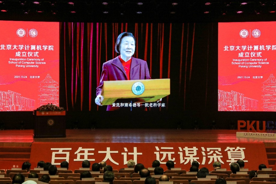 计算机学院名誉院长杨芙清院士发表视频致辞。她回顾了北大计算机学科半个多世纪以来的发展历程:1955年北大设立计算数学专业;1956年设立半导体专业;1959年设立计算机专业;1969年国务院向北京大学下达研制每秒100万次大型集成电路计算机任务,1973年研制成功;1975年打破技术封锁,研制出1024位MOS动态存储器,成为第三个掌握这一技术的国家;1978年改革开放,在三个专业基础上正式成立计算机科学技术系,建设了一流的师资队伍,加强了思想教育,承担起青鸟工程,完成了多项国家科技攻关任务和863高科技国家项目;2002年信息科学技术学院组建,学院形成了“厚基础、强复合、宽视野、高素质、高质量”的本科生培养体系和以研究所为主体、科学研究和研究生培养紧密结合的新模式。杨芙清对办好计算机学院提出三点建议:一是扎根于基础理论研究,弄通卡脖子技术问题的基础理论和技术原理,瞄准世界科技前沿,抓住大趋势;二是重视高端人才的培养,要在吸引优秀本科生的基础上,培养有高尚的爱国主义情操,甘于坐冷板凳,勇于做栽树人、挖井人,德才兼备,善于分析问题、解决问题的高素质、高水平、复合创新型研究人才;三是大力支持本科生教育,这是学院优质生源的重要来源,也是学院的最重要任务之一。她表示,要将最新的科技成果融入本科生教育之中,营造“以人格魅力引导学生的心灵,以学术造诣开启学生智慧之门”的优秀教师竞相承担本科生教学的氛围。