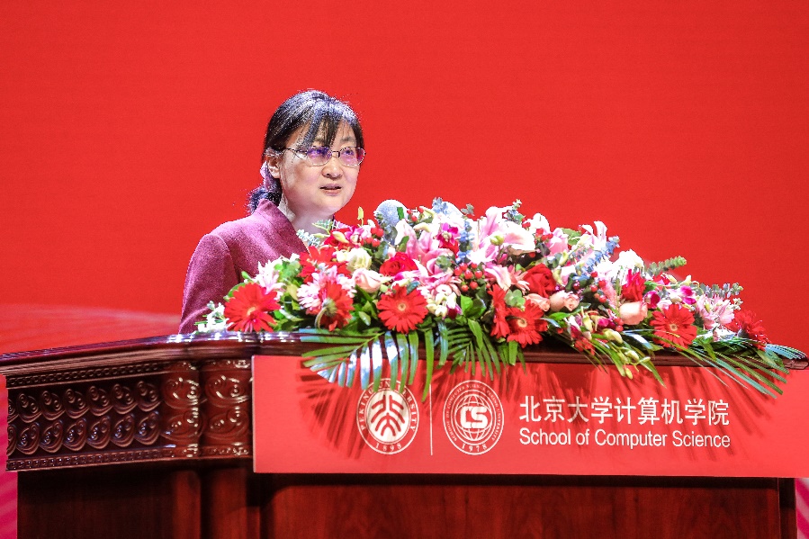 清华大学计算机科学与技术系主任尹霞代表兄弟院校致辞。她表示,北大计算机科学技术系在43年的发展历程中,始终坚守北大兼容并蓄、思想自由的优良传统,一代代师生勇于开拓,奋勇拼搏,为我国计算机科学事业的发展作出重要贡献。清华大学与北京大学在多年合作发展的基础上,不仅形成了两校互通互融的格局,同时也具有各自特色鲜明的学术风格,肩负着共同的历史使命——为祖国建设世界一流的计算机学科。今后,双方应当围绕国家战略,树立顶天立地做科研的理念,共同探索中国特色的计算机学科顶尖人才培养体系,重视以全球视野谋划和推动创新发展,积极融入全球创新网络,参与全球科技治理。她希望清华计算机系和北大计算机学院携手并进,砥砺前行,为我国计算机学科和教育事业发展,为推动国家技术创新,为建成国际顶尖的计算机学科贡献更大的力量。