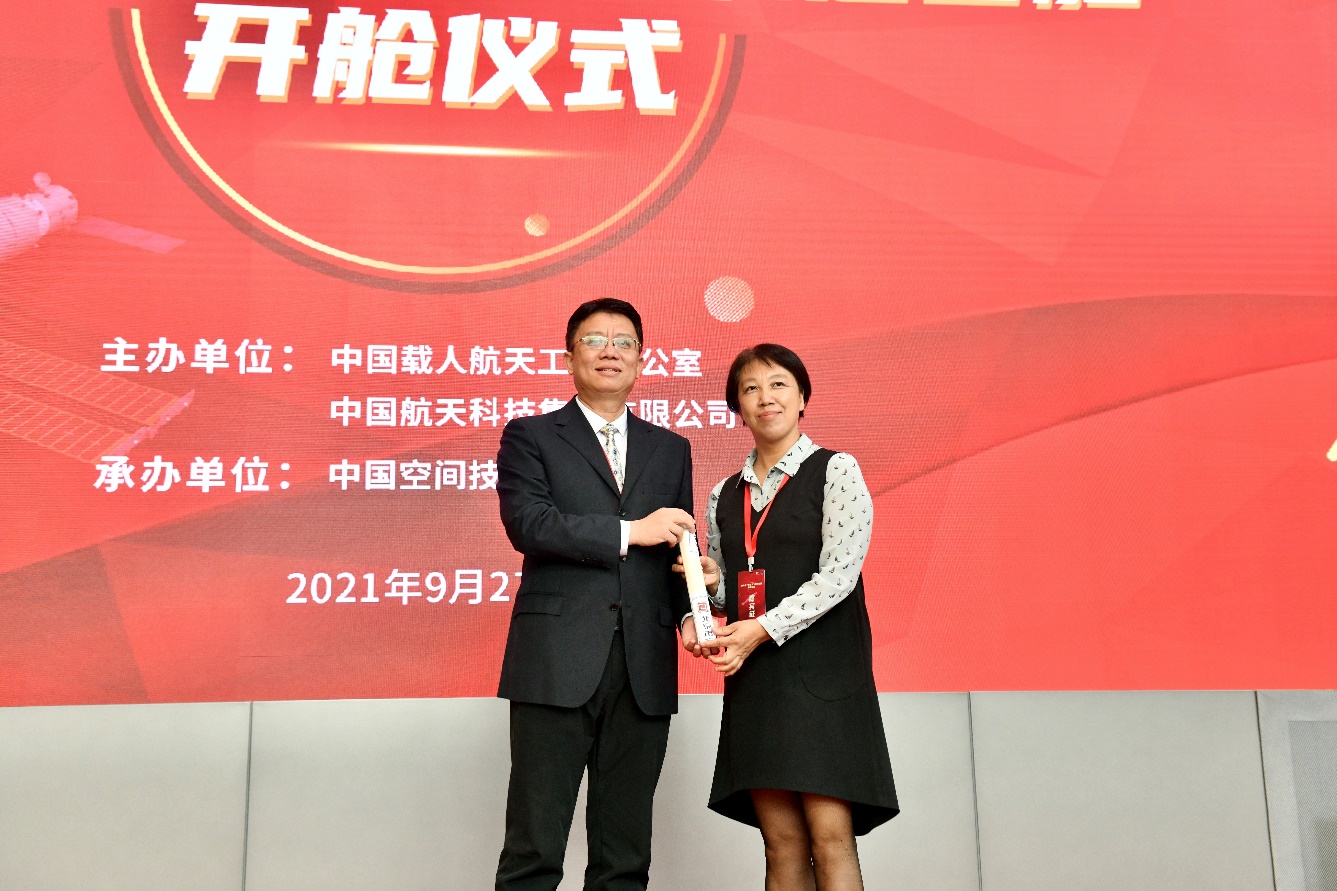 中国航天科技集团有限公司宇航部副部长李峰向北京大学出版社张凤珠副总编辑移交搭载物品